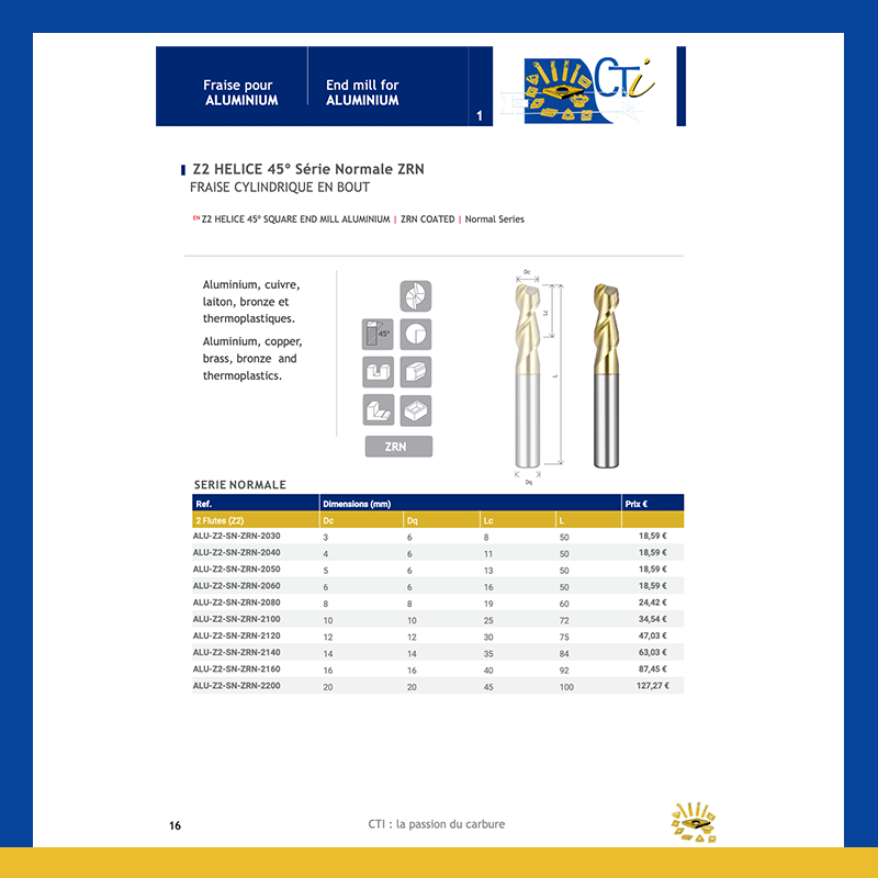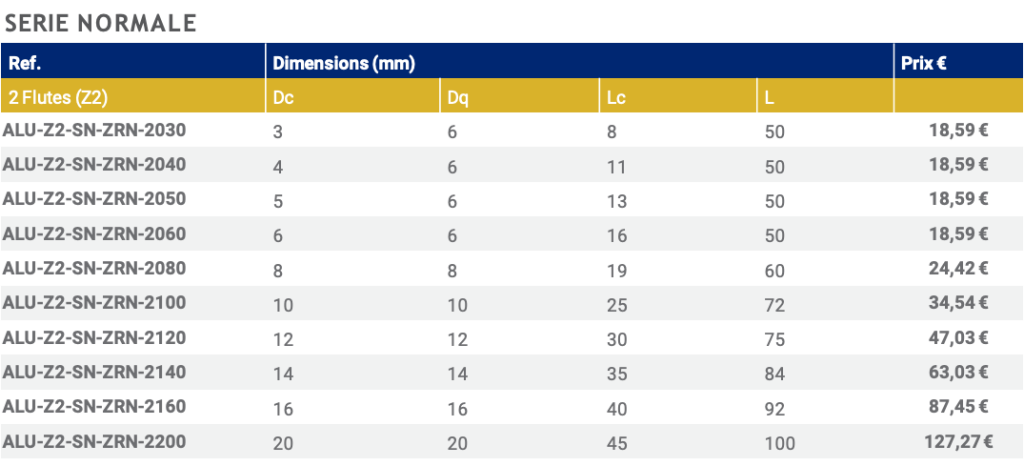 Z3 FRAISE CYLINDRIQUE EN BOUT – HELICE 45º Série Normale ZRN