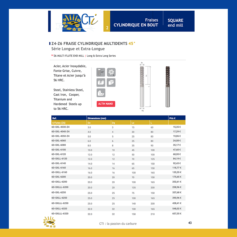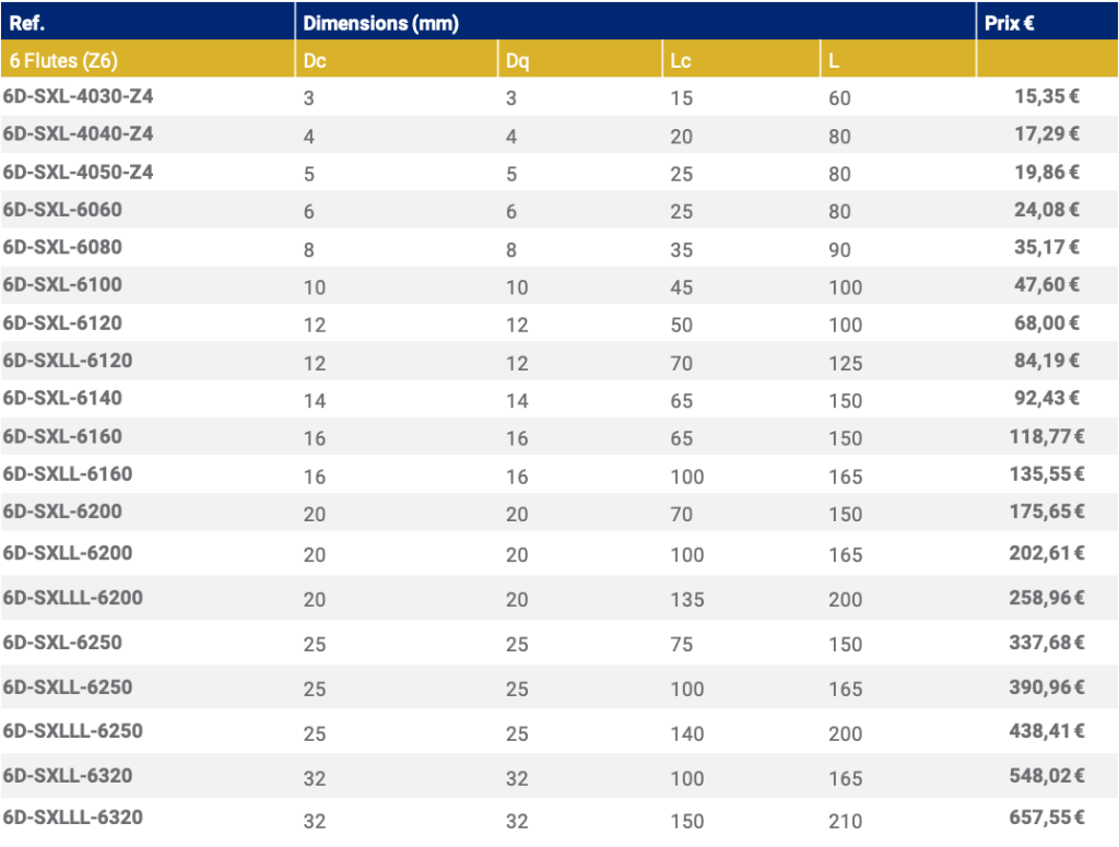 139,00 €Le prix initial était : 139,00 €.115,00 €Le prix actuel est : 115,00 €. KIT 6 – Z4 FRAISE CYLINDRIQUE EN BOUT 30° Série Normale