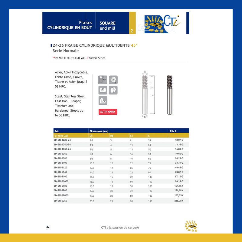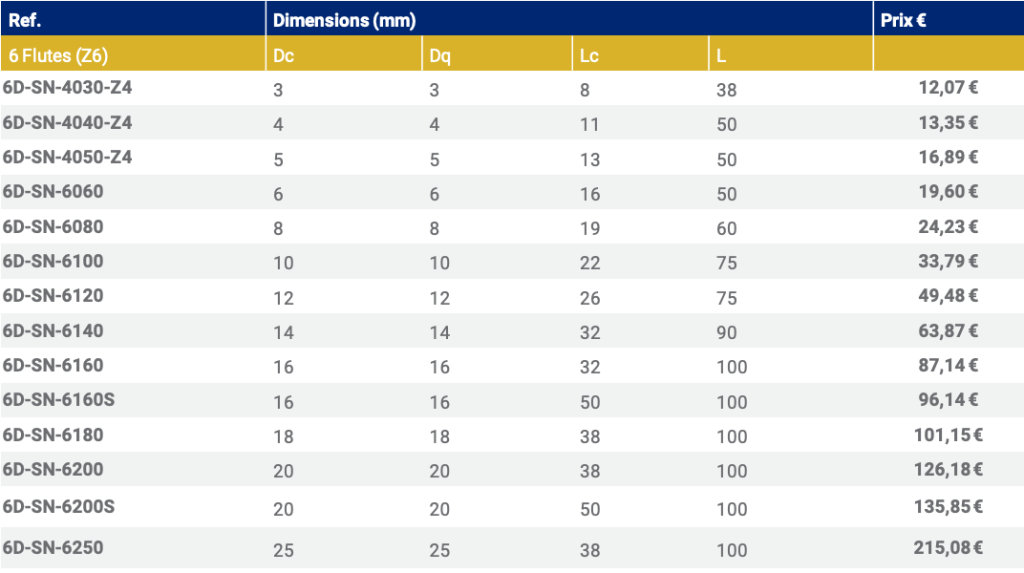 139,00 €Le prix initial était : 139,00 €.115,00 €Le prix actuel est : 115,00 €. KIT 6 – Z4 FRAISE CYLINDRIQUE EN BOUT 30° Série Normale